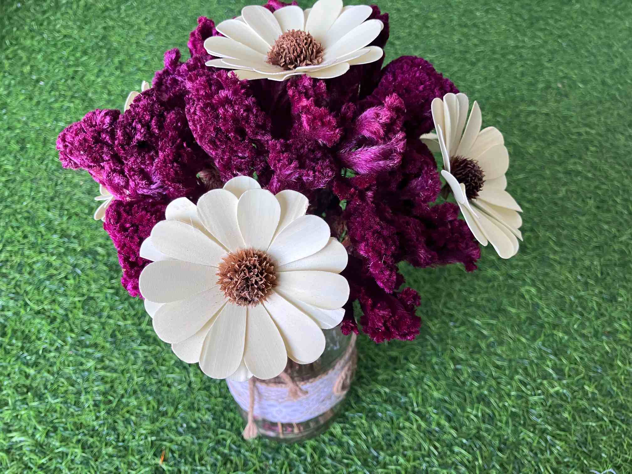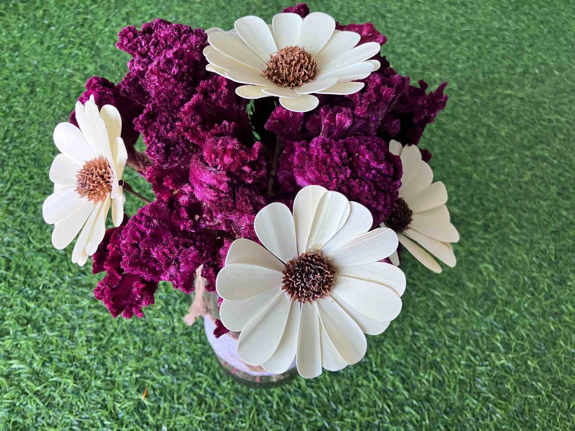 Premium, Sustainable Materials: Featuring high-quality dried Gomphrena and eco-friendly Sola Wood Roses, this is a beautiful choice for the conscious consumer.