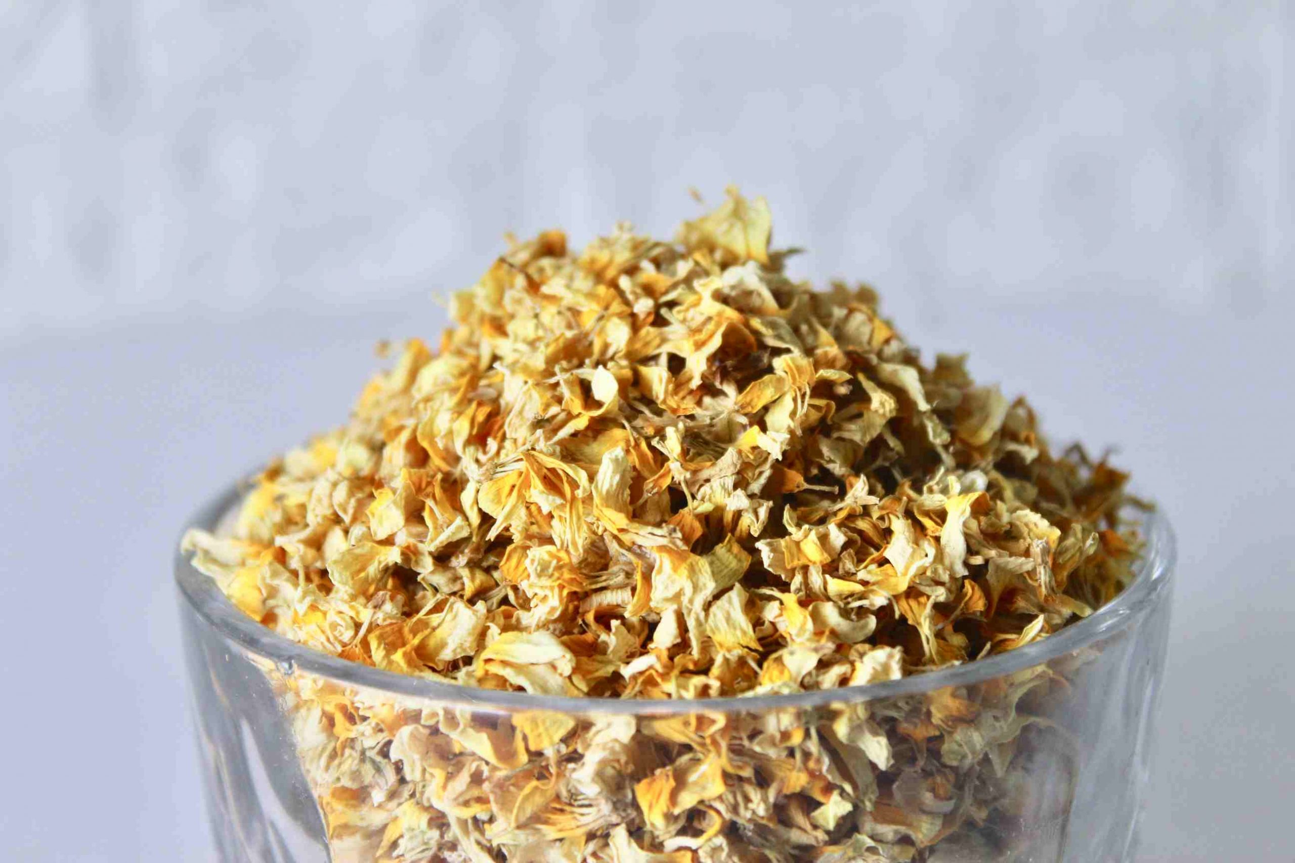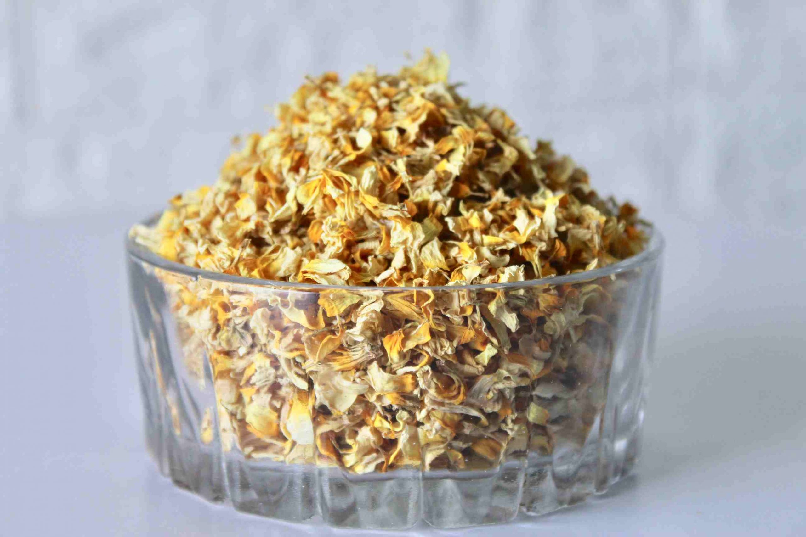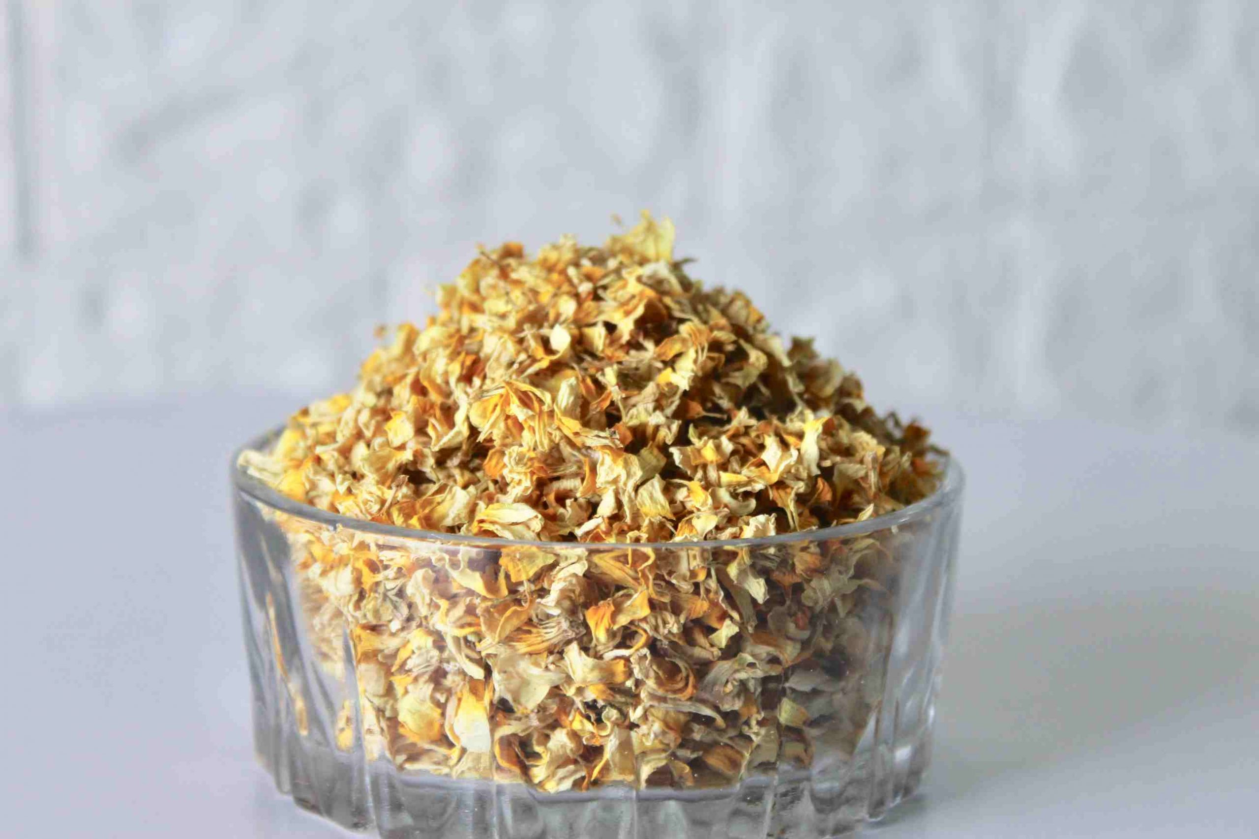 Organic dried chamomile flowers are a versatile and cherished natural remedy known for their soothing and calming properties. Grown without the use of pesticides or chemicals, these delicate flowers are carefully harvested and dried to preserve their natural goodness. Chamomile is renowned for its ability to promote relaxation, reduce stress, and aid in sleep, making it a popular choice for herbal teas and wellness products.
