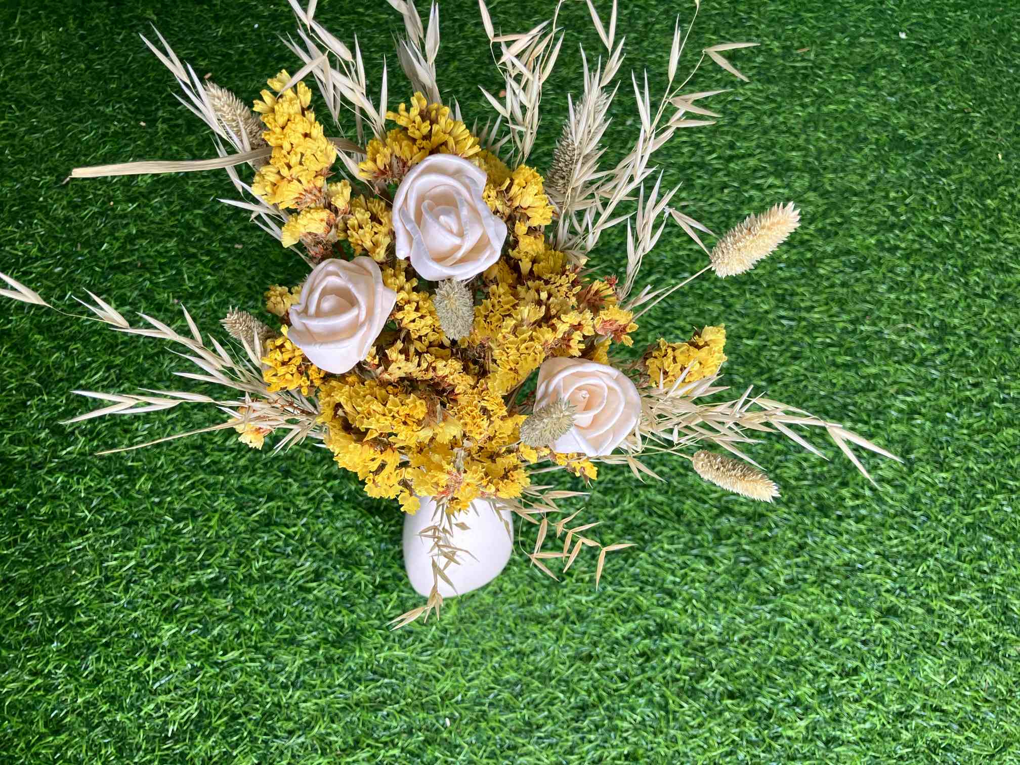 Capture the warm, radiant glow of a summer meadow all year round with our Dried Yellow Flowers Bouquet. This expertly crafted arrangement combines a delightful mix of textures and hues, from delicate grasses to soft bunny tails, creating a stunning and long-lasting piece of natural art. Forget fleeting fresh flowers; this bouquet brings permanent, sun-kissed joy to any space.