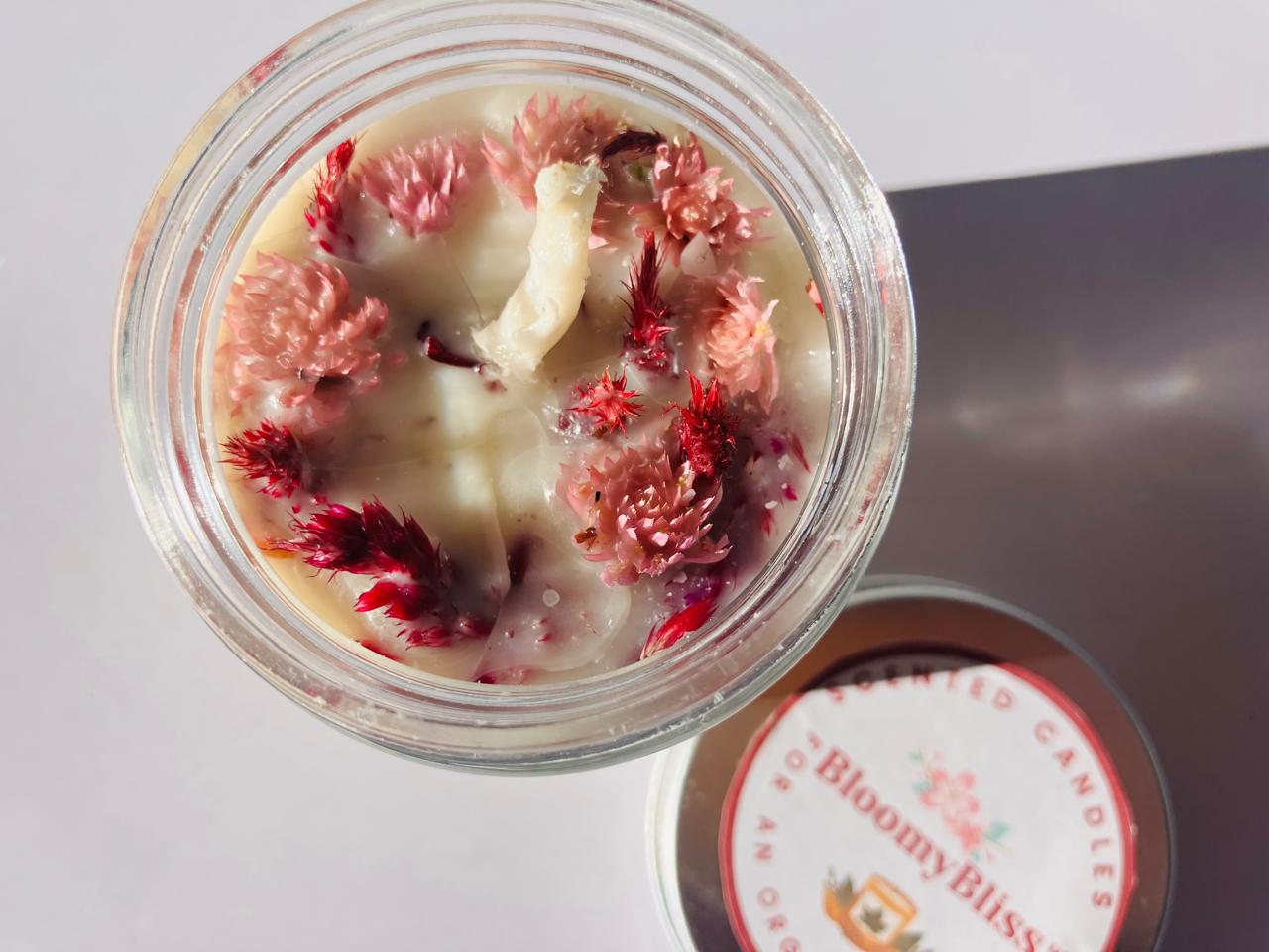 Experience the natural beauty and soothing fragrances of the BloomyBliss Scented Candle—a perfect blend of elegance and eco-conscious living.