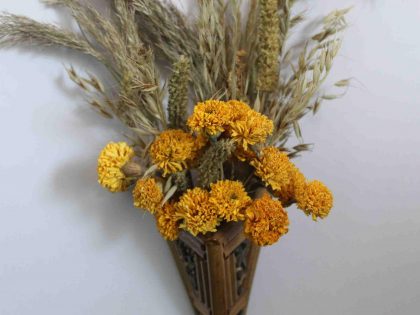 Dry gomphrena,  celosia, soy wax, and lavender essential oil.
